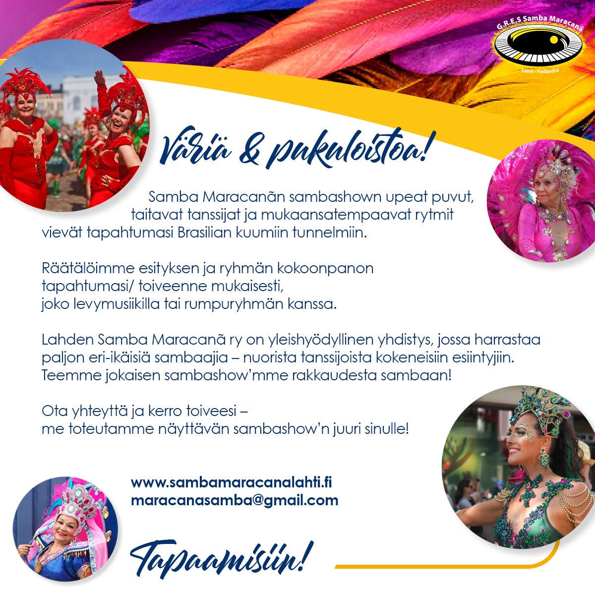 Samba Maracanã, Suomen vanhin sambakoulu (perustettu Lahdessa 1981) tuo tapahtumaasi iloisen ja värikkään sambashow’n, joka voidaan räätälöidä tilaajan toiveen mukaan.