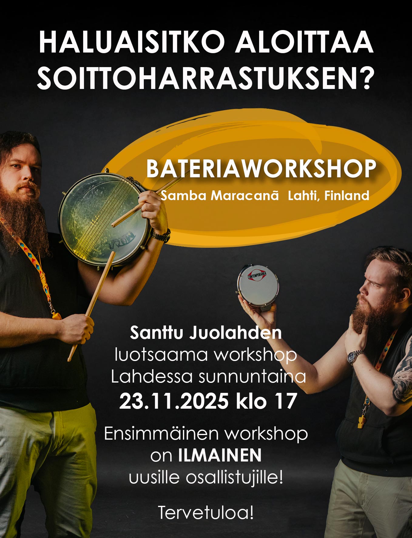 Haluaisitko aloittaa soittoharrastuksen? Tule tutustumaan samban rytmeihin sunnuntaina 23.11. klo 17 Samba Maracanãn tiloissa (Svinhufvudinkatu 23 A, 3. krs)!